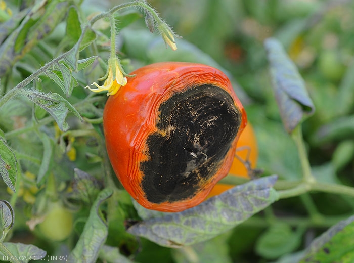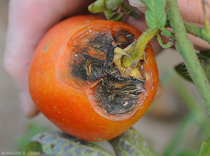 Inicialmente aparecen en los frutos lesiones de tamaño limitado y contorno mal definido, cóncavo y húmedo. A menudo se encuentran cerca del tallo o en el área del tallo de la fruta llamada "hombro" ( hombro ) por los anglosajones (Figuras 1 a 3). Posteriormente, se diseminan gradualmente y los tejidos subcuticulares ubicados en su centro pronto se vuelven marrones y luego ennegrecidos. Nótese que Alternaria alternata puede colonizar secundariamente el extremo del fruto (figura 4), como otras especies de Alternaria , y en particular las lesiones provocadas por la enfermedad fisiológica denominada necrosis apical del tomate.