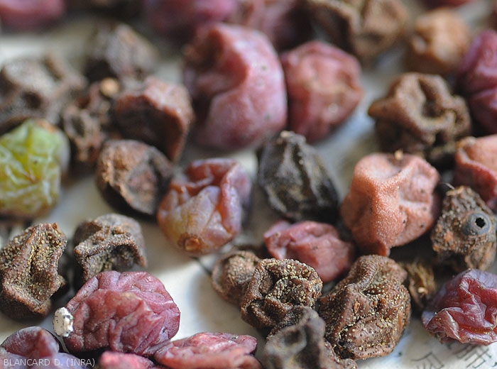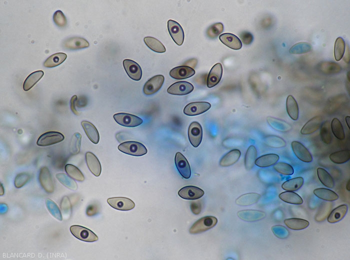 En todos los órganos colonizados, el hongo produce numerosos picnidios esféricos (figura 2) más o menos aplanados, volviéndose gradualmente de color marrón. Por ejemplo, en cada baya de uva se pueden contar hasta al menos 200. Estas estructuras fúngicas producen varios cientos de esporas (figura 3) que son extruidas de los picnidios por el ostiolo, en forma de matrices mucilaginosas. Los conidios estarán en el origen de las contaminaciones secundarias que estarán aseguradas especialmente por las lluvias, las salpicaduras de agua, los trabajadores trabajando cuando la vegetación es húmeda, etc.