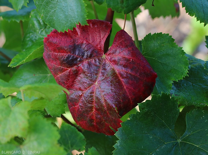La hembra realiza una incisión levemente curvada y larga de unos 5 a 7 mm en la dirección del largo de la rama para depositar sus huevos, incisión que dificulta la circulación de la savia, terminando a finales del verano con la formación de un "traumático mancha roja "de la parte posterior de la rama (enrojecimiento de las hojas) . La formación de una cicatriz negra (figura 1) debido a la reacción del cambium a las picaduras de oviposición da como resultado el "enrojecimiento" del extremo de la rama, debido a la interrupción del flujo del floema de las hojas a la vid ( figuras 2 a 7). Las hojas también pueden curvarse alrededor de los bordes que, en las variedades de uva tinta, recuerdan los síntomas de la flavescencia dorée.