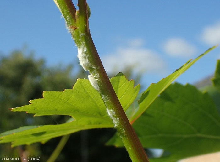 Las larvas aparecen durante el mes de abril hasta el mes de septiembre. Los estadios larvarios son 5 para un período de desarrollo de 40 días, los dos últimos estadios tienen forma de alas. Estas larvas viven en el envés de las hojas y luego migran durante su desarrollo hacia las ramitas jóvenes del año (figura 1) así como hacia los racimos, donde forman las características mangas algodonosas. Estas larvas se pueden observar hasta octubre.