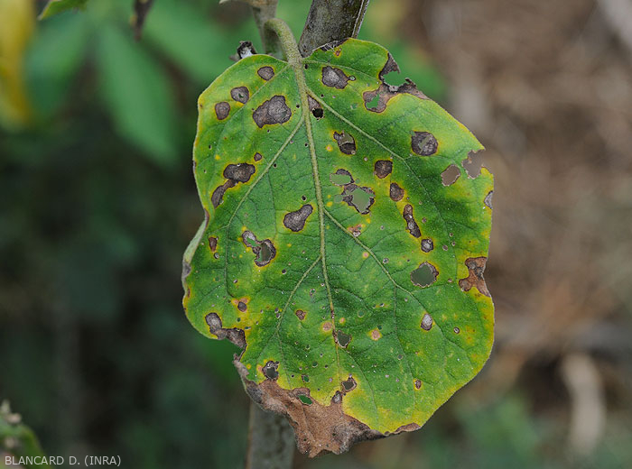 Signos : presencia de estromas miceliales negros y cuerpos fructíferos que salpican las lesiones y, en ocasiones, les confieren un tinte gris claro. Estos cuerpos fructíferos consisten en conidióforos parduscos agrupados, con conidios hialinos septados y ligeramente arqueados.