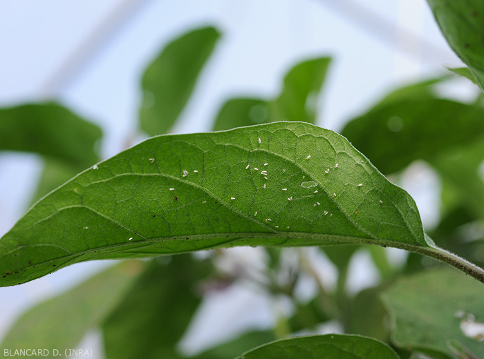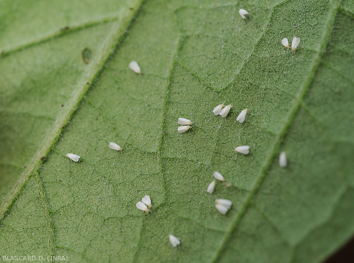 Muchos virus como TYLCV (figura) y PYMV pueden ser transmitidos por eventualmente Bemisia tabaci, en particular en las solanáceas, lo que conduce a la muerte de la planta. Trialeurodes vaporariorum a veces puede transmitir virus.