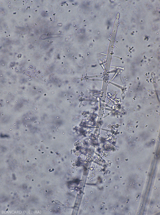 Esporulación : produce un moho blanco en todos sus hospedadores, al igual que en los restos vegetales, está formado por micelio y numerosos conidióforos de ramificación larga que producen numerosos conidios que aseguran la diseminación de Botryosprium spp.
