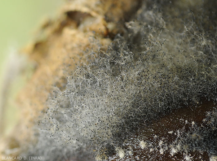 - Signos : un moho peludo aéreo negruzco cubre más o menos el tejido podrido. Son visibles frutos en forma de diminutas cabezas de alfiler negras, materializando el micelio, pero también los esporangióforos del hongo.