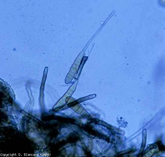 Signalons que des conidiophores et des conidies du champignon, pluricellulaires en forme de massue, peuvent être observés à la face inférieure du limbe, sur les tissus lésés, ceci grâce à une loupe binoculaire et/ou un microscope (figure 4).