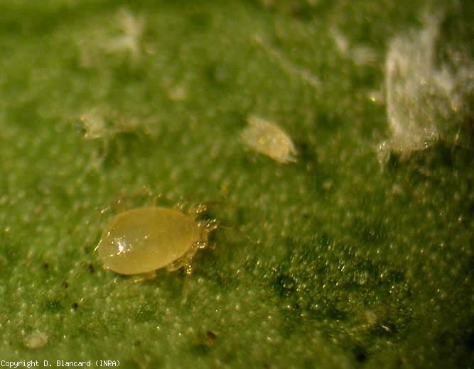 Les acariens (mites), qui font partie, comme les insectes, de l'embranchement des arthropodes, appartiennent à la classe des Arachnides (araignées…). Les adultes possèdent quatre paires de pattes, contrairement aux insectes qui n'en ont que trois. Plusieurs familles d'acariens comprennent des espèces planticoles nuisibles, la plus connue est celle des Tetranychydae ; ces espèces sont couramment dénommées « acariens », voire « araignées » jaunes, rouges ou vertes (figures 1 et 2). Soulignons que quelques espèces s'attaquent à la tomate, dont Tetranychus urticae (Koch) qui est l'acarien le plus largement signalé sur cette culture. Appelé aussi « tétranique tisserand » (spider mite) à cause des toiles qu'il forme sur les plantes, il est cosmopolite, commun et très polyphage puisque signalé sur près de 2 000 espèces végétales. Il peut être responsable de dégâts importants, voire d'infestations fulgurantes, notamment sous abris, ceci sur de nombreuses cultures ornementales et légumières. Des cas de résistances aux acaricides ont été signalés à plusieurs reprises chez cet acarien. D'autres espèces de Tetranychidae phytophages, ainsi que des acariens prédateurs Phytoseiidae, peuvent ponctuellement se rencontrer sur tomate.