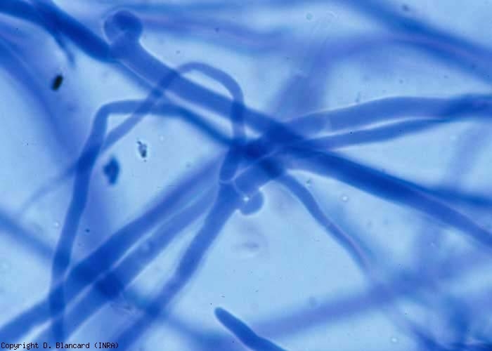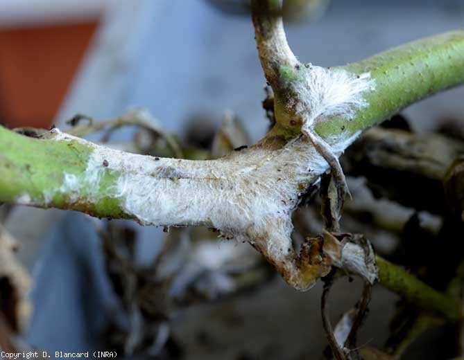 Las primeras contaminaciones se producen a través del micelio ya presente en el suelo (Figuras 4 y 5) o de los esclerocios. A menudo se localizan en las partes de las plantas ubicadas al nivel de la superficie del suelo, cerca o en contacto con este último. A. rolfsii , cuando está cerca de un huésped potencial, produce enzimas líticas como las poligalacturonasas, así como ácido oxálico , un veneno que causa la muerte celular . Así, puede penetrar directamente en los tejidos e invadirlos después de haberlos descompuesto gracias a la acción combinada de los compuestos precedentes. Su evolución inter e intracelular es muy rápida, especialmente si las condiciones climáticas le son favorables. Este proceso parasitario , que dura de 2 a 10 días dependiendo de las condiciones climáticas, está en el origen de los deterioros húmedos y pudriciones que se observan en los distintos órganos. En el tejido dañado, forma rápidamente micelio y esclerocios. Estos pueden germinar rápidamente porque no necesitan una fase latente. Sin embargo, pueden permanecer en el suelo durante varios años sin germinar.