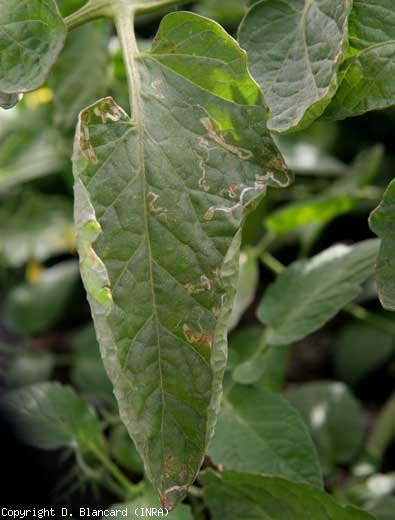 varios polífagos minadores de hojas Es probable que ataquen los cultivos de hortalizas y, a veces, los tomates, que toleran bastante bien la presencia de estas plagas. Estos insectos se clasifican en el orden de la familia Diptera y Agromyzidae. Las principales especies de minadores de hojas que se encuentran en Europa son el minador de la hoja del tomate ( Liriomyza bryoniae Kaltenbach, a menudo llamado erróneamente " Liriomyza strigata " [Meigen]), el minador de hojas americano ( Liriomyza trifolii Burgess), el minador de hojas sudamericano ( Liriomyza huidobrensis Blanchard y Liriomyza strigata Meigen) ) y el minador de hojas hortícolas ( Chomatomyia horticola Goureau). Señalemos que su proliferación a menudo cuestiona el control biológico en invernadero. Además, varios de ellos están clasificados como plagas cuarentenarias.