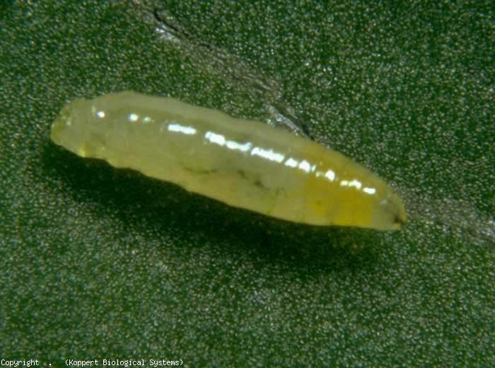 - Etapas de desarrollo : los huevos (figura 3-1), de color crema y forma ovalada (los de Liriomyza bryoniae miden 0,12 x 0,27 mm), se depositan en los tejidos durante las punciones de la mordedura con el uso del ovipositor hembra. Una hembra puede producir varios cientos de huevos que posteriormente eclosionan y dan a luz larvas transparentes de 0,5 mm de largo (Figura 3-2) (Figuras 7 y 5). Estos cavan galerías en los folletos que la presencia de excrementos negros hace claramente visibles. Las larvas blancas del tercer estadio de 2,5 mm de largo perforan la hoja, dejan los folíolos, caen en pliegues de plástico o en el suelo y se entierran a poca profundidad. Posteriormente, se transforman en pupas (Figura 3-3) con forma de barril y cuyo color varía a medida que envejecen desde el amarillo al marrón oscuro (Figura 6), siendo las pupas negruzcas las que suelen ser parasitadas. La pupación de Chromatomyia horticola tiene lugar en la hoja: el pupario, cubierto por la epidermis de la hoja, es entonces visible en forma de una pequeña protuberancia al final de la galería larvaria. Los adultos (Figura 4-4) son pequeñas moscas de 2-3 mm de longitud, de color amarillo y negro ( Liriomyza spp., Figura 7) o gris negruzco (C hromatomyia horticola ). Las hembras adultas, presentes en la superficie superior del limbo, perforan la epidermis gracias a la verdadera barrena que es su ovipositor, chupan el jugo de la verdura (bocado nutritivo) y depositan sus huevos (bocados de puesta de huevos). Tenga en cuenta que los machos, desprovistos de barrenas, también aprovechan las picaduras para alimentarse.