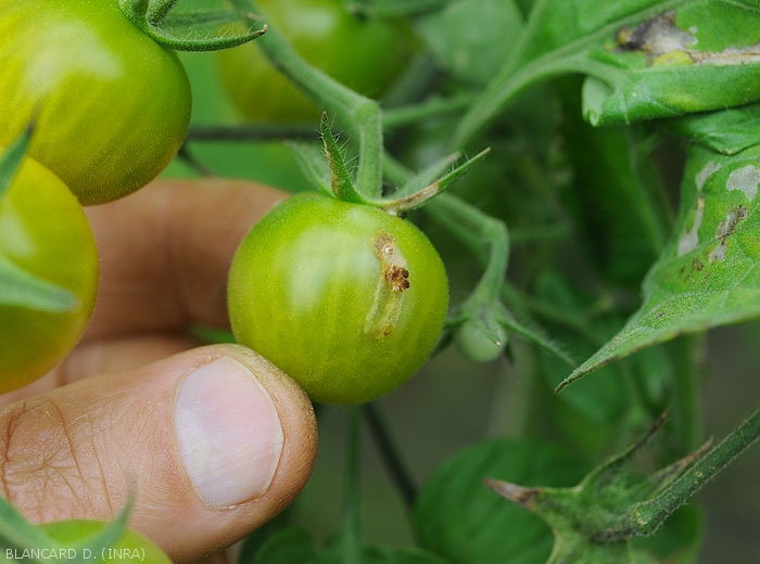 Las larvas de T. absoluta cavan minas y galerías en los órganos aéreos del tomate. Las hojas muestran minas, manchas irregulares blanquecinas que gradualmente se vuelven marrones y necróticas. Solo los tejidos del mesófilo se ven afectados, la epidermis permanece intacta. Las hojas muy parasitadas pueden necrodearse por completo. Los frutos verdes, como los maduros, son parasitados; están más o menos sembrados de galerías y orificios de salida. Estos a veces permiten que los invasores secundarios provoquen diversas pudriciones durante el cultivo y durante su conservación. Tenga en cuenta que las frutas parasitadas a menudo no se pueden vender. Pueden aparecer galerías en tallos jóvenes, lo que interrumpe el desarrollo de la planta. Las heces negras son visibles aquí y allá en los órganos afectados; también materializan las acciones de esta plaga.