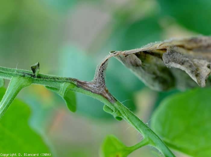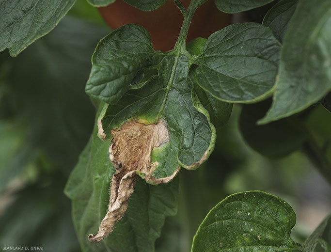 Los folíolos muestran con frecuencia manchas bastante circulares y húmedas al principio (Figuras 3 y 4). De tono beige a marrón claro , también revelan un aspecto pergamino y revelan los arabescos concéntricos (Figura 5). Evolucionan rápidamente y provocan el secado de sectores importantes de la cuchilla (figura 6). Estas alteraciones pueden dar lugar a una pudrición que luego se propaga y eventualmente daña hojas enteras, con el colapso los tejidos y la necrosis gradual de . Habiendo ganado los pecíolos (figura 7), esta podredumbre podrá asentarse en el tallo (figura 8).