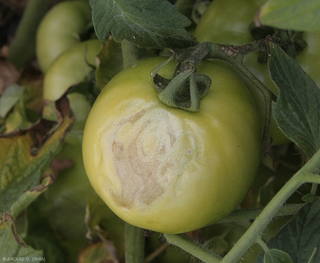 En verdes o giratorias quemaduras (quemaduras quemaduras frutas , las , solares solares solares ) provocan manchas que a veces aparecen en el lado más expuesto a la luz solar directa, durante períodos climáticos muy calurosos. Estas lesiones son irregulares, blanquecinas en su centro y más o menos rodeadas de un halo amarillo (Figuras 1 a 4). Están ligeramente deprimidos, su superficie está más o menos arrugada y adquiere una textura seca que recuerda al papel. A menudo superficiales, a veces son invadidos por varios hongos oportunistas, en particular Alternaria alternata . En este caso, un moho de color marrón a negro los cubre gradualmente.
