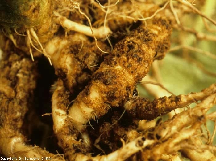 Spongospora subterranea, champignon aquatique maintenant classé dans les Protozoa, est surtout connu comme responsable de la gale poudreuse de la pomme de terre, mais il est aussi capable de s'attaquer à de nombreuses autres solanacées, cultivées ou non. Ses symptômes sur racines de tomate sont assez rarement signalés. Pourtant, cette plante est sensible à ce parasite obligatoire qui produit d'abord sur ses racines des pustules blanches qui évoluent rapidement en tumeurs. Ces dernières brunissent progressivement et deviennent superficiellement liégeuses (figures 1 et 2).
