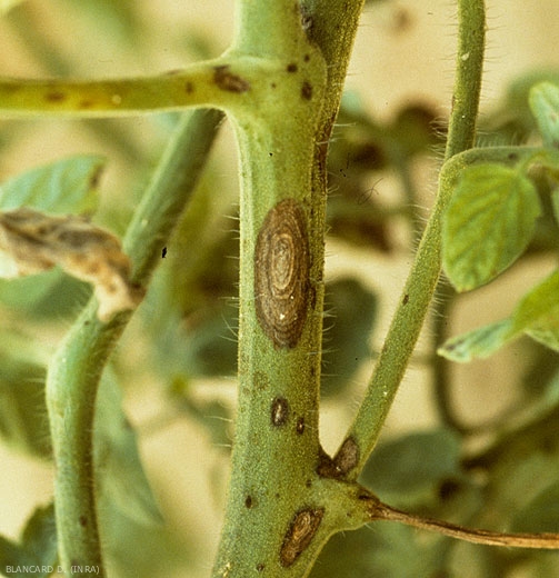 De manchas bastante similares también se encuentran en las varillas (Figura 4), los pecíolos (Figura 5) y los tallos ; tienen un tinte negruzco y a menudo tienen una forma más alargada. Estas lesiones pueden rodear el órgano afectado y causar muerte regresiva de su parte distal.