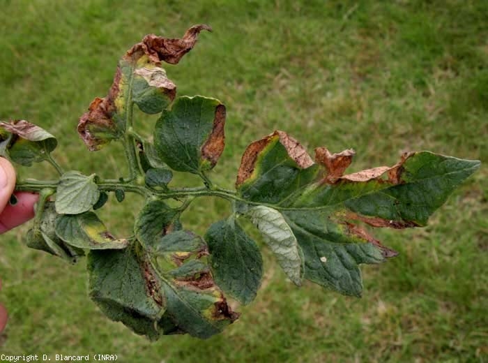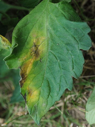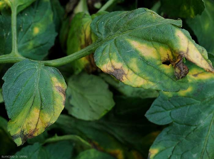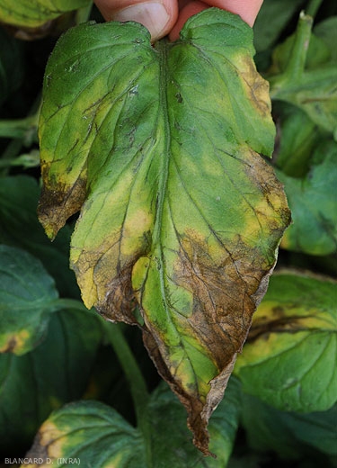 Las plantas afectadas por Verticillium dahliae muestran frecuentemente un discreto marchitamiento de los folíolos inferiores en los momentos más calurosos del día. Al principio, este marchitamiento es reversible de la noche a la mañana. Posteriormente, a medida que se desarrolla la enfermedad, se puede observar que ciertos sectores del limbo, a menudo interveinales y en forma de “V”, se ablandan gradualmente y se vuelven amarillos (figuras 1 a 3). Grandes porciones de los folíolos eventualmente se vuelven de color beige a marrón y luego se necrosa (Figuras 3 a 8). Los folíolos y hojas así afectados mueren prematuramente, lo que puede llevar a la exposición de los frutos a la radiación solar y por tanto al riesgo de quemaduras solares .