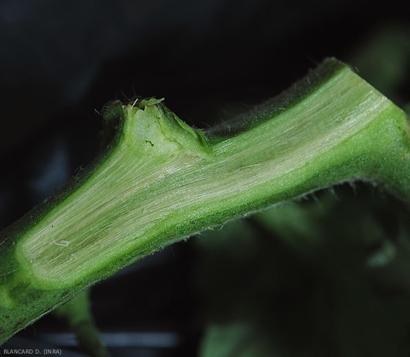 Un corte longitudinal o transversal en los vasos de la parte inferior del tallo o de una rama muestra que presentan un ligero pardeamiento , mucho menos marcado que en el caso del marchitamiento por Fusarium (Figuras 9 y 12).