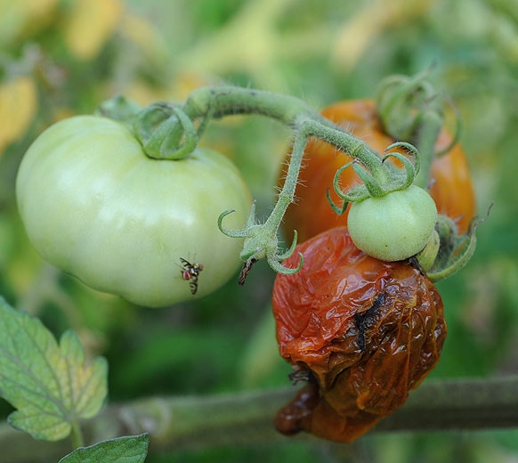 Los frutos afectados presentan pinchazos correspondientes a picaduras de adultos; generalmente son claramente visibles (Figuras 6 y 7). Paralelamente al desarrollo y daño ligado a la actividad de los gusanos, los frutos son colonizados por diversas plagas patógenas u oportunistas que progresivamente hacen que se pudran (Figuras 8 a 10). En Mayotte, esta especie causa un daño significativo a los tomates, que puede afectar la mayor parte de la cosecha si no se trata.