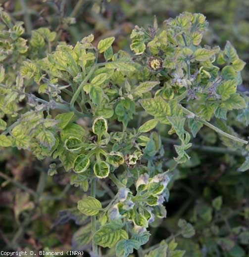 Las hojas , además de estar deformadas, también presentan diversas anomalías de color ; son más o menos amarillos (amarillos) (figuras 4 a 8) y / o violáceos (antocianinas) (figuras 9 a 11). A veces aparecen raíces adventicias en los tallos. Las plantas infectadas temprano tienen un hábito bastante tupido, en parte relacionado con el desarrollo de numerosos axilares.