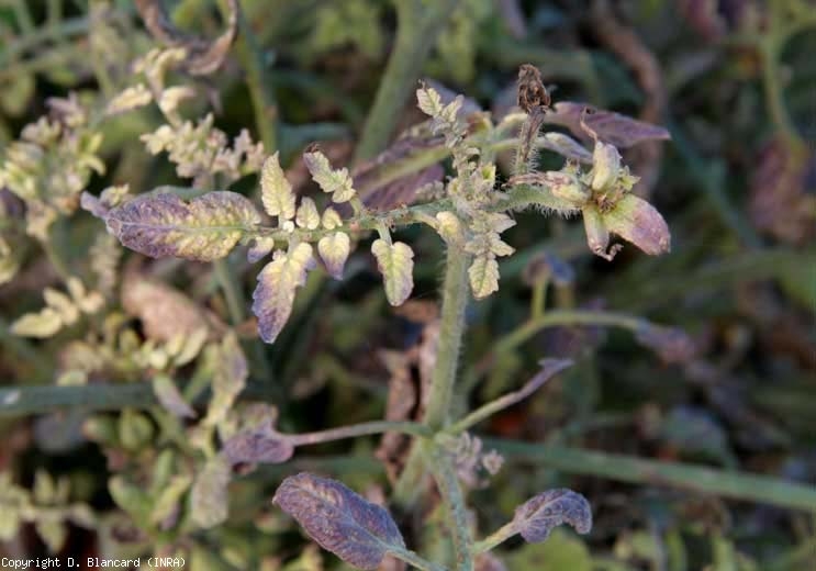 Los fitoplasmas que atacan al tomate provocan diversos síntomas en los órganos aéreos, jóvenes y en crecimiento, de esta solanácea. En Francia, a menudo aparecen durante el mes de julio o incluso a principios de agosto. A partir de este período, el crecimiento de las plantas afectadas a menudo se ralentiza . Los ápices forman entrenudos más cortos y hojas más pequeñas, a veces enrolladas. Los tejidos de la lámina suelen ser más gruesos e incluso quebradizos (Figuras 1 a 3).