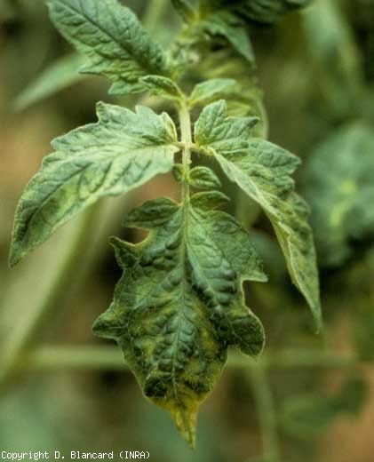 Los síntomas causados ​​por el del TMV varían según la cepa. Podemos observar en los folíolos y hojas un ligero moteado, un mosaico de verde a amarillo (Figuras 1 a 3). En condiciones invernales, se producen deformaciones de las hojas. El ancho de los folletos se reduce considerablemente, en este caso hablaremos de "filiformie" (figuras 4 y 5).