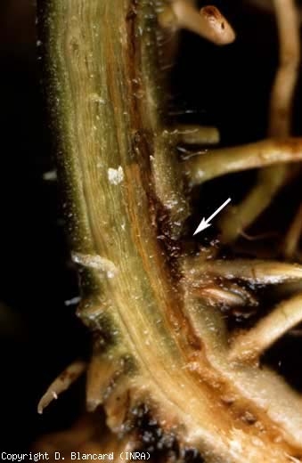 Con un chancro frecuencia se desarrolla en el cuello . Inicialmente se vuelve marrón oscuro y el tejido enfermo está más o menos deprimido (Figura 4). Este chancro suele evolucionar longitudinalmente, en un lado del tallo, tomando la forma de una llama que puede extenderse hasta más de 30 cm por encima del cuello (figuras 5 y 6). La parte central del chancro adquiere un tinte rosado salmón y un aspecto bastante mucoso, debido a la formación de la esporodoquia fúngica (figura 7).