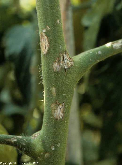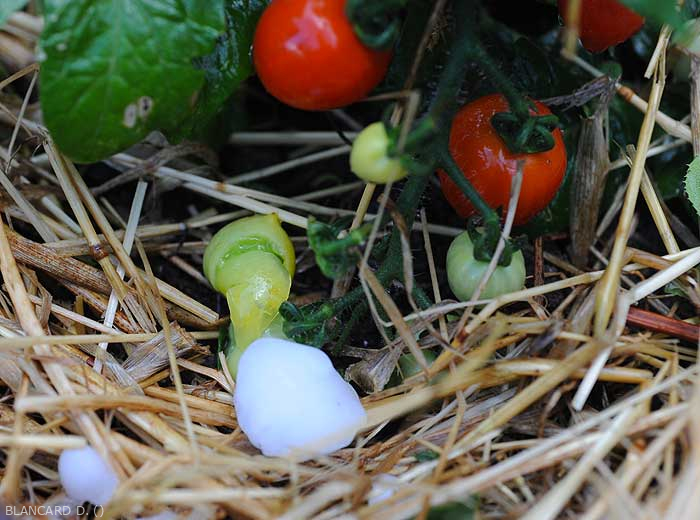 Después de fuertes lluvias, acompañadas de granizo, no es raro observar en los cultivos de tomate a campo abierto daños significativos ( lesiones por granizo ), especialmente cuando se cultivan en plano. De hecho, este modo de producción los hace especialmente vulnerables al granizo. Estos últimos, al golpear los folíolos, provocan agujeros y desgarros (figura 1), que pueden alterar en gran medida su potencial fotosintético posteriormente. Algunas hojas se pueden triturar totalmente. Tenga en cuenta que estas diferentes lesiones también pueden promover la instalación de varios patógenos. Los granizos también son causantes de cambios necróticos parduscos, estallidos más o menos pronunciados en su punto de impacto en el tallo (figura 2), pero especialmente en los frutos.