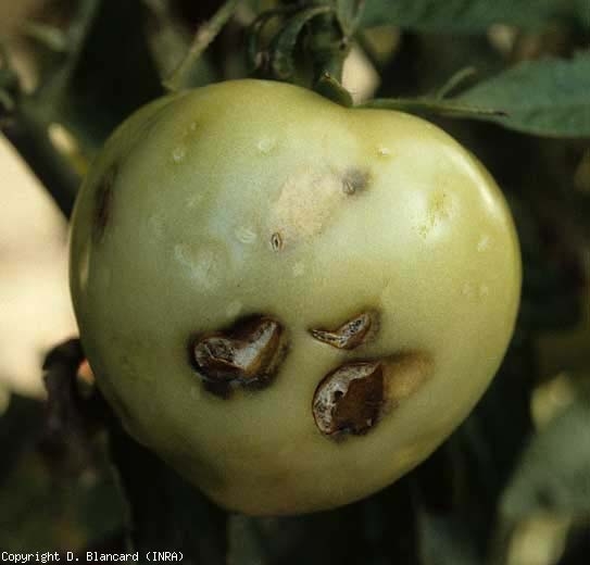 De hecho, los frutos son especialmente vulnerables a los granizos que, cuando los golpean, provocan estallidos más o menos pronunciados en los puntos de impacto. Posteriormente aparecen lesiones parduscas en los puntos de impacto (figuras 3 a 5) más o menos suberizadas, que en ocasiones recuerdan las manchas corchosas provocadas por Xanthomonas spp ..