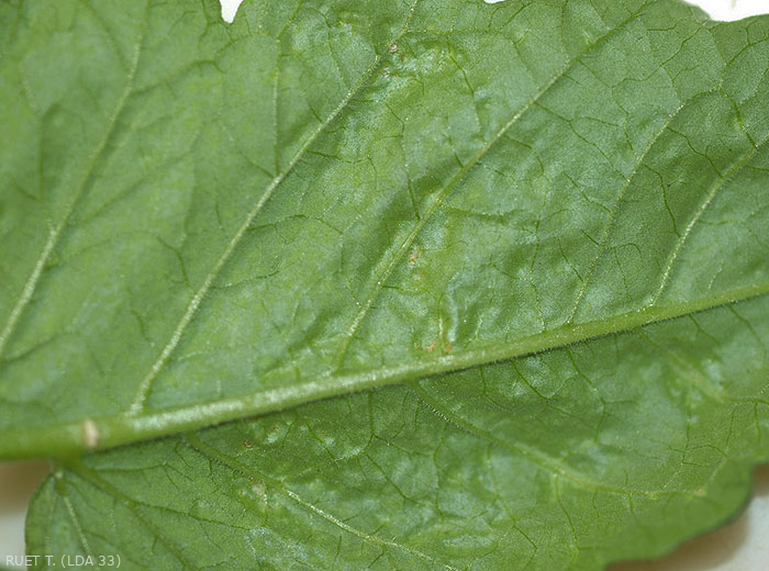 Manchas cloróticas más o menos distribuidas cerca de las nervaduras aparecen con frecuencia en las hojas inferiores (figura 1).