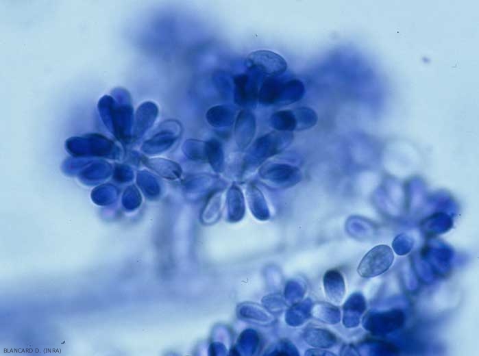 En todos sus hospedadores, así como en los restos vegetales, produce micelio y numerosos conidióforos largos y ramificados (Figuras 2 y 3). En sus extremos emergen conidios ovoides a esféricos (figura 4), que aseguran la diseminación de Botrytis cinerea . Esto se produce principalmente a través del viento y las corrientes de aire, en menor medida la lluvia y las salpicaduras. También lo aseguran los trabajadores durante las operaciones de cultivo. El micelio es la fuente de contaminación por el contacto del tejido enfermo con el tejido sano. Botrytis cinerea también forma en los tejidos dañados pequeños esclerocios planos que aseguran su conservación.