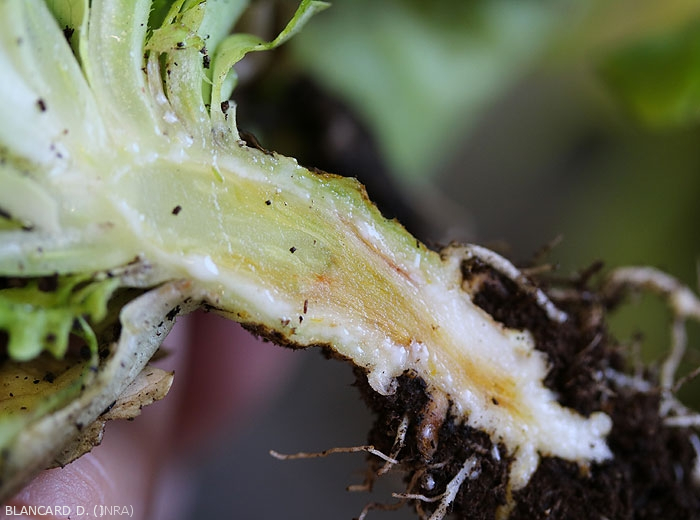 Las plantas adultas afectadas muestran síntomas radiculares y vasculares comparables a los observados en las plántulas. Una sección longitudinal revela vasos de color marrón (figura 2). Como resultado, las hojas de un lado de la lechuga se vuelven amarillas y se necrosan alrededor del borde del limbo.