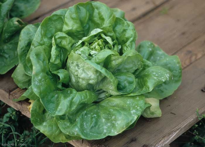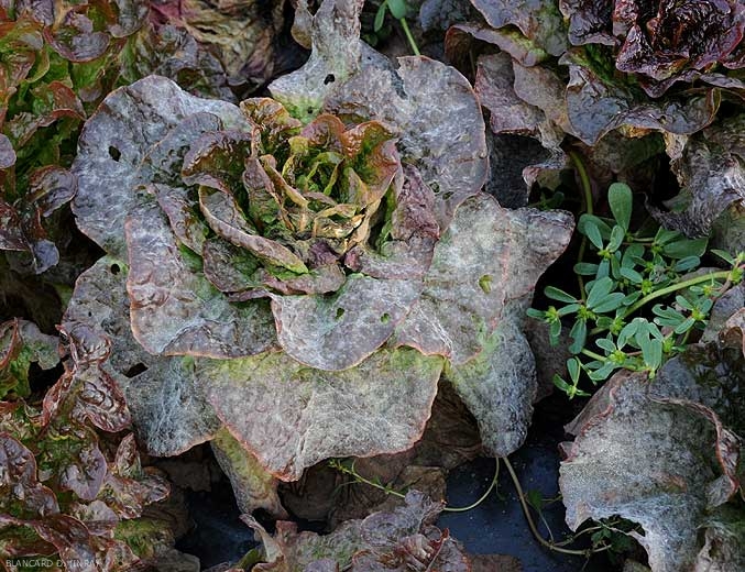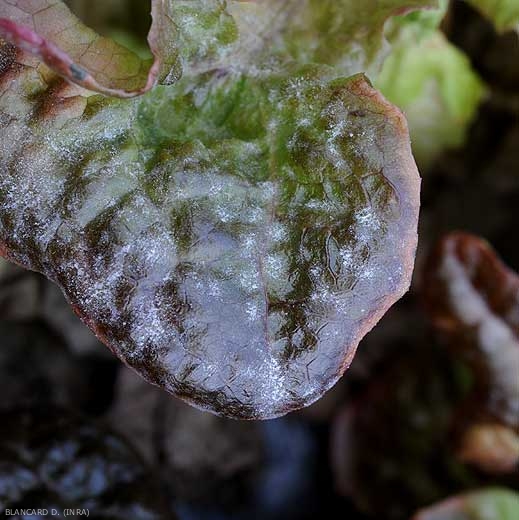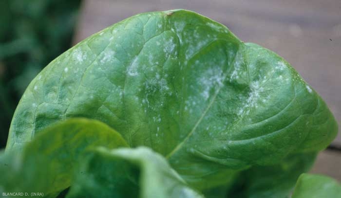 Plantas afectadas por Golovinomyces cichoracearum var. cichoracearum presentan síntomas muy característicos independientemente de la edad de las plantas (Figuras 1 y 2). Un color blanco grisáceo, polvo fieltro primeros aparece como manchas sobre las superficies superiores de las hojas viejas (Figuras 3-6). Estos se extienden gradualmente y se fusionan para cubrir una porción más o menos importante del limbo (figura 2). A veces, las manchas son visibles debajo de la hoja. Los tejidos afectados suelen ser cloróticos y presentan lesiones marrones (Figura 6), irregulares, tras la muerte de las células vegetales.