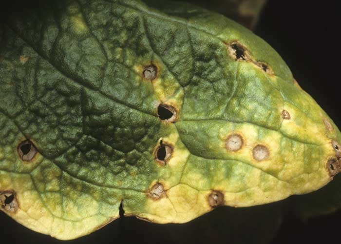 Este hongo es el principal responsable de las manchas en todas las partes de las hojas cercanas al suelo (figura 1). En la lámina de la hoja, estos son inicialmente pequeños y húmedos (figura 2). Posteriormente, se expanden y se vuelven bastante circulares. Su delimitación por las nervaduras puede darles un aspecto anguloso. El tejido dañado se vuelve de color naranja a marrón. No tardan mucho en adelgazarse, ya que se secan, se parten y se caen (Figura 3). Así se tamizan las hojas (figura 4).