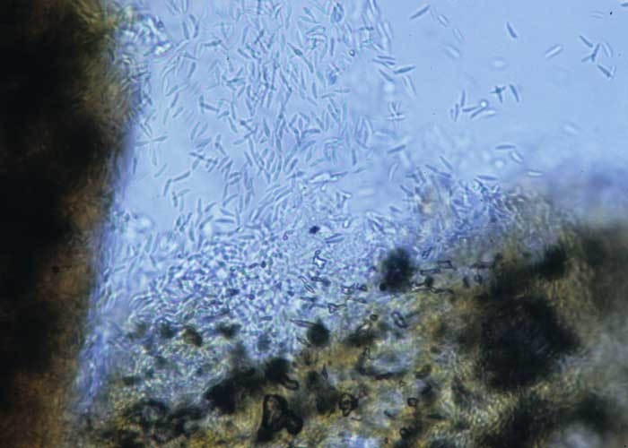 En la periferia de las manchas, se forman masas de esporas discretas de color blanquecino a rosado; son los acérvulos (o esporodochia, figura 6) de Microdochium panattonianum los que aseguran su reproducción asexual (anamórfica).