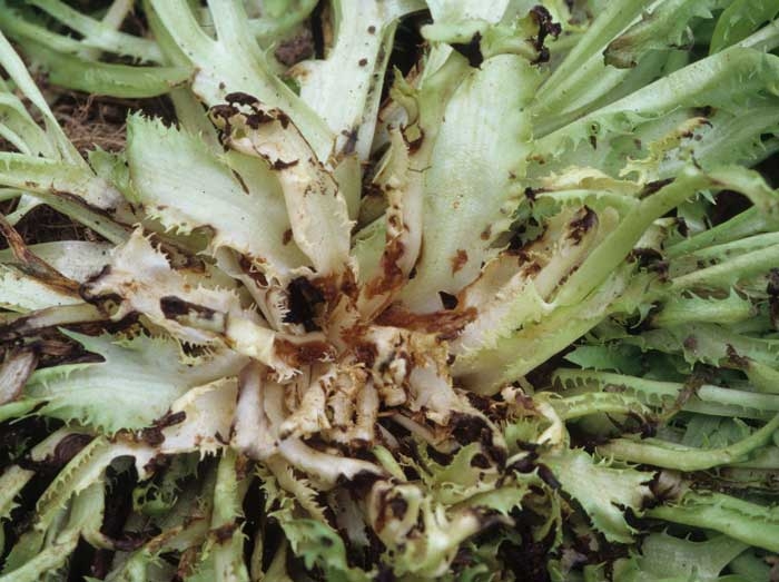 Sur chicorées scarole ou frisée, on retrouve à peu près les mêmes symptômes. Les lésions sont plus brunes à noires (figure 5). De plus, Thanatephorus cucumeris donne l'impression d'épargner momentanément la nervure principale (figure 6).