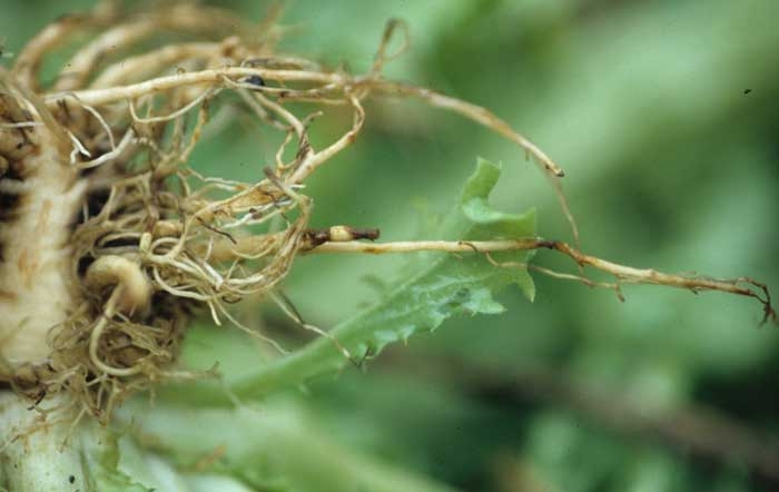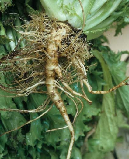 En France, bien que le champignon soit présent dans de nombreux sols, aucun dégât n'avait été observé sur salades. Mais, nous avons pu mettre en évidence Thielaviopsis basicola sur des chicorées frisées peu poussantes (figure 1), cultivées en plein champ dans les Pyrénées-Orientales. De nombreuses racines de ces plantes étaient brunes à noires (figures 2 et 5) ; les plus grosses d'entre elles présentaient des altérations et des manchons liégeux en surface.