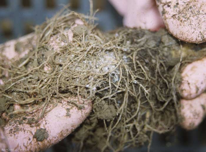 Pemphigus bursarius est un puceron, à la biologie particulière, qui colonise les racines des laitues, chicorées et autres Astéracées comme le laiteron. Les aptères y prospèrent. Les salades affectées sont souvent peu vigoureuses et chlorotiques. De fortes attaques peuvent conduire au flétrissement complet des plantes. On constate par ailleurs, le long des racines, de très nombreux insectes blanc jaunâtre, portant une touffe de cire blanche assez bien visible (figures 1 à 5).