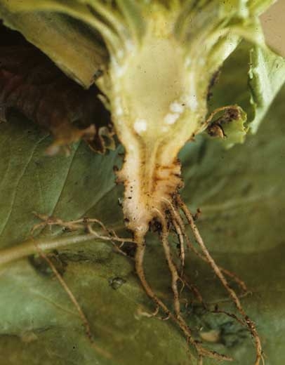 Cabe recordar que en Australia se han observado pudriciones del tallo de la lechuga, en ausencia de daño a las raíces. Las plantas afectadas se marchitaron y colapsaron en 2 a 4 semanas. En tejido alterado, se pueden ver ovogonias y esporangios de Phytophthora . Se una Phytophthora porri ha implicado a , que ataca principalmente al tallo de la lechuga; sin embargo, se ha demostrado que es incapaz de parasitar puerros y repollos.
