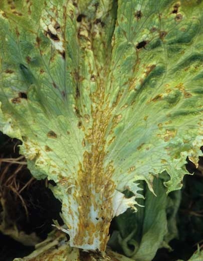 Microdochium panattonianum, champignon responsable de l'anthracnose des salades, s'attaque à l'ensemble du limbe. Sur les nervures, les taches qu'il engendre prennent un aspect particulier. Elles sont toujours plus allongées que sur le limbe et fortement déprimées (figure 1). Dans certains cas, on peut parler de taches chancreuses.