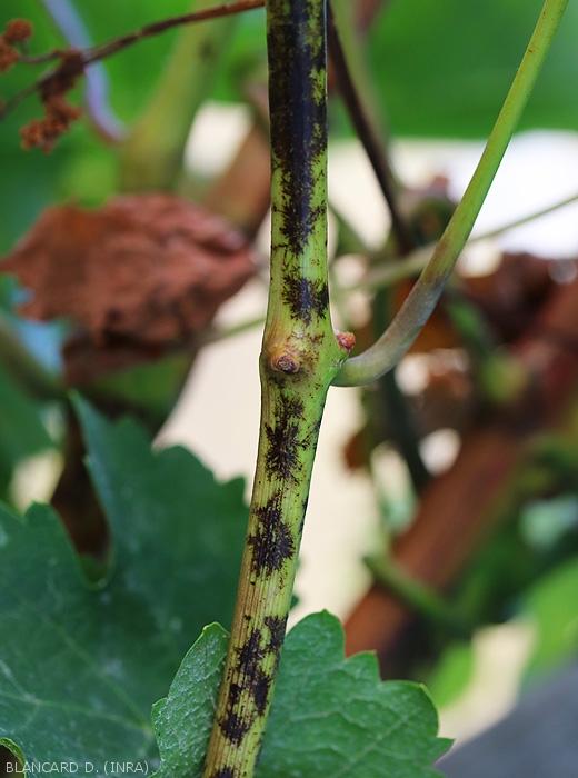 Las ramitas jóvenes también son colonizadas por E. necator . Recubiertos por su micelio, presentan manchas, incluso zonas irregulares y mal definidas más o menos polvorientas. El endurecimiento de las ramitas oidizadas suele ser parcial y, en el otoño, las áreas afectadas por E. necator adquieren un tinte de marrón a negruzco que siempre es visible durante el invierno (Figuras 7 y 8).