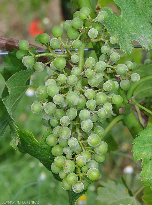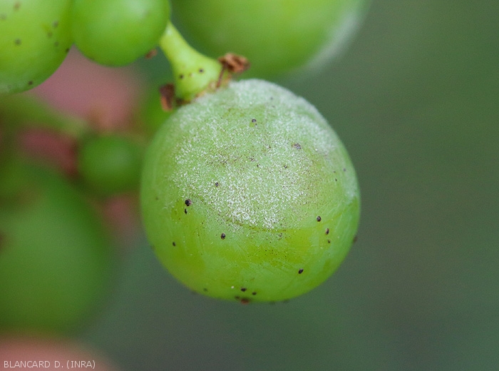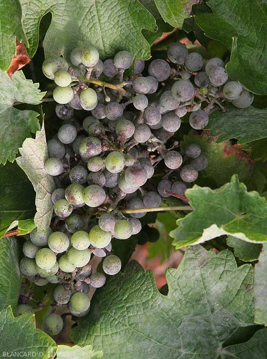 Las inflorescencias y las bayas de las uvas pueden ser atacadas desde la floración hasta el cierre del racimo (Figuras 9 a 10). Si los primeros están muy infectados, entonces hay una flacidez significativa. Las bayas se cubren de mildiú polvoriento que les da un tinte gris verdoso, su crecimiento se ralentiza mucho y su piel se vuelve más gruesa y corchosa. Pueden aparecer ráfagas (figura 11), revelando los pips. Agreguemos que estas heridas favorecen contaminaciones de Botrytis cinerea y microorganismos responsables de la pudrición ácida .