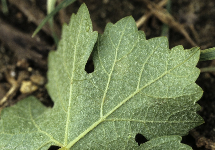 - pequeñas manchas dispersas, ligeramente cloróticas, vellosas que se desarrollan en el envés (figura 1), luego en el lado superior de las hojas (figura 2). Estas manchas, a menudo consecutivas a contaminaciones primarias por ascosporas, se propagan y se vuelven cada vez más polvorientas (figura 3). Hay islas de células marrones necróticas. El follaje fuertemente atacado muestra hojas más o menos deformadas (figuras 4 y 5) y adquiere un tinte grisáceo, dando la impresión de estar cubierto por el polvo del suelo;