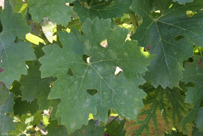 Erysiphe necator es un ectoparásito de la vid que crece en gran parte en la superficie de los órganos aéreos verdes. Su presencia en este último se materializa por un fieltro de conidios más o menos polvoriento en el origen del nombre anglosajón de la enfermedad del mildiú polvoroso y caracterizando estos síntomas.