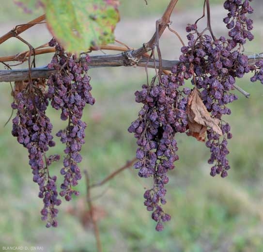 Las bayas a veces muestran un retraso en la madurez o se marchitan (figura 6), o incluso tienen pequeñas manchas marrones o violáceas en su superficie.