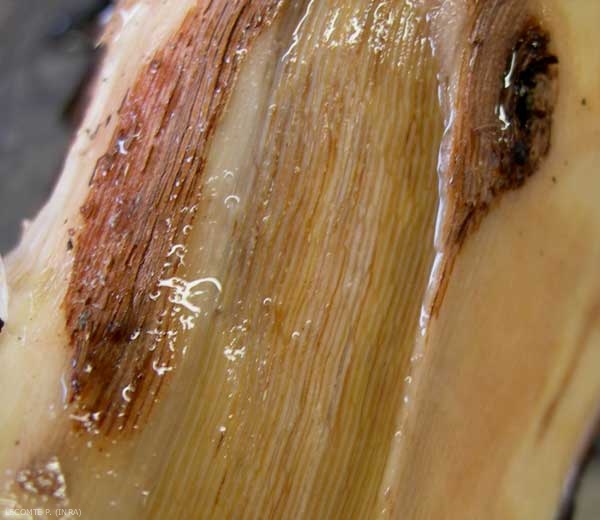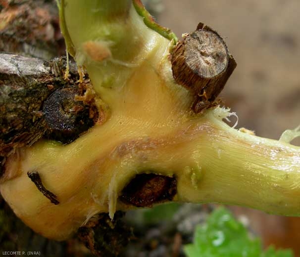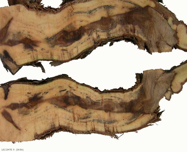 ** Los dos hongos pioneros, Phaeomoniella chlamydospora y y de Phaeoacremonium aleophilum las perforaciones negras , son responsables de la necrosis marrón central o sectorial visibles en las vides. menudo se aíslan otros hongos de la necrosis sectorial: varias especies de Botryosphaeria y, a veces, Agreguemos Eutypa lata, que a responsable de la eutipia.