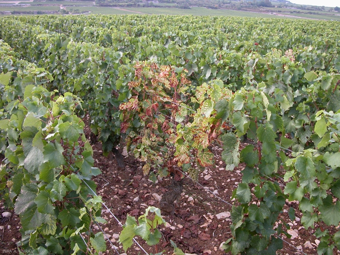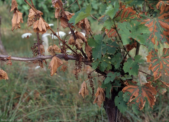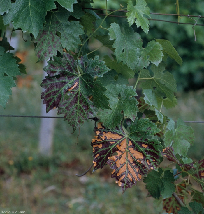 • Una forma lenta caracterizada por decoloraciones variables de las hojas, la hoja de tomar un tinte amarillo o rojo en variedades de uva blanca, y amarillo en variedades de uva negras (Figuras 3 a 5). Estas decoloraciones pueden ir acompañadas de lesiones foliares necróticas que forman digitalizaciones entre las nervaduras que provocan la apariencia atigrada de las hojas. (Fotos). Si estos últimos se ven gravemente afectados, pueden secarse por completo y desprenderse de las ramitas.