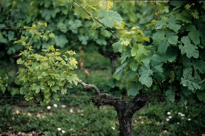 A diferencia de la esca, los primeros síntomas notables durante la vegetación se observan en primavera en ramitas herbáceas jóvenes . Todos los brotes de un brazo infectado o solo unos pocos muestran un crecimiento lento con entrenudos cortos y más o menos regulares (Figura 5). Las hojas son, en general, pequeñas, a menudo cloróticas, encrespadas o retorcidas, a veces irregulares. También se forman manchas necróticas en la lámina de la hoja que luego pueden extenderse a toda la hoja. En una etapa más avanzada de la enfermedad, las ramitas suelen tener hojas en blanco o incluso carecen de ellas. En una etapa final, el brazo que lleva ramitas atrofiadas puede marchitarse durante la temporada.