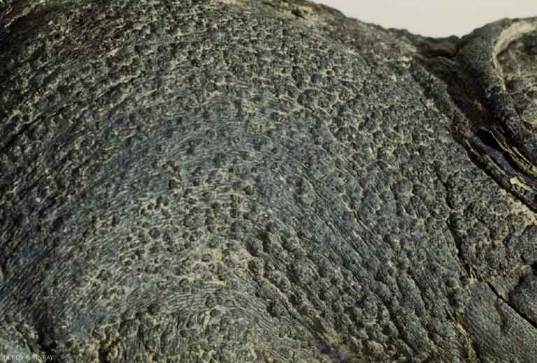 Los cortes transversales en brazos o tronco de tocones enfermos permiten observar una necrosis de madera dura, de color marrón, siempre sectorial y bien delimitada en la extensión de una herida o zona de poda (figuras 1 y 2). La madera se degrada gradualmente a una podredumbre seca de tipo cúbico y se rompe muy fácilmente. La rotura obtenida recuerda a la observada en el caso de un núcleo cortado por la mitad manualmente. En las zonas de madera muerta, donde la corteza se ha exfoliado, se observan zonas rugosas de color grisáceo a negruzco que contienen cuerpos fructíferos globulares del hongo, y en particular la peritecia (Figuras 3 y 4).