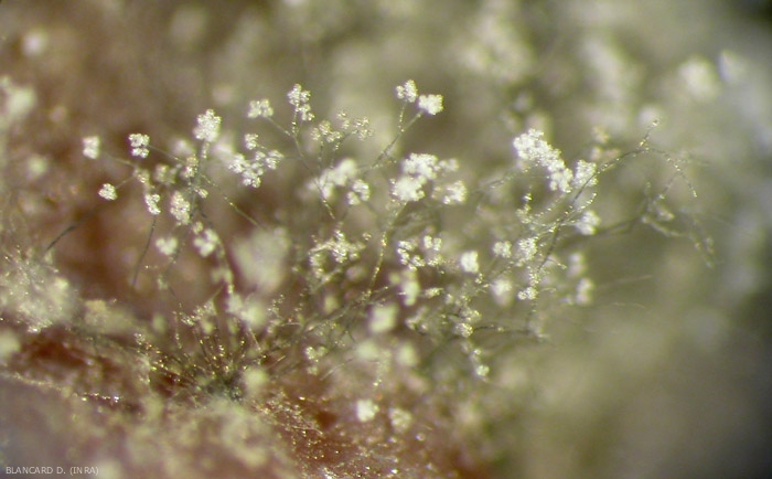 Independientemente de los órganos afectados, los tejidos moribundos quedan cubiertos por un moho gris denso muy característico (figura 13), formado por los numerosos conidióforos y conidios del hongo (figura 14). Nótese que en los racimos de botrytis, en el corazón de este último, se desarrollan otros mohos, formando colonias de varios colores asociados o superando el moho gris (ver otras pudriciones del racimo) (figuras 15 a 17).