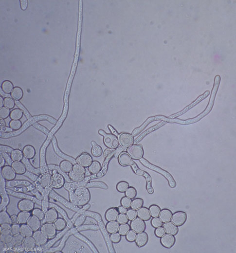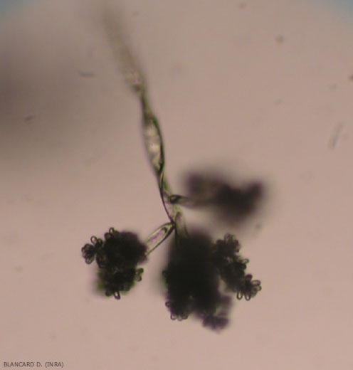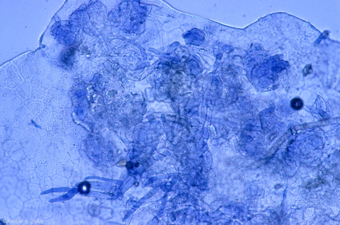 contaminaciones Las primarias suelen ser aéreas; se trata de conidios (figura 2) formados al final del invierno y en primavera, en particular a partir de esclerocios y micelio y fácilmente transportados por el viento. Estas esporas germinan en unas pocas horas a temperaturas entre 1 y 30 ° C (la óptima es 18-20 ° C) en órganos húmedos y / o en presencia de una humedad ambiental de al menos el 90%. La germinación de los conidios se ve fuertemente afectada a temperaturas superiores a 30 ° C.