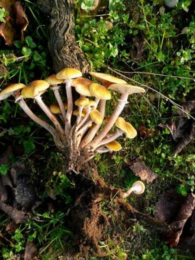 - Amillaria mellea afecta a las raíces cuya corteza se vuelve marrón y se desprende fácilmente, en ausencia de micelio externo visible. Por otro lado, se puede observar, entre la corteza y la madera, una red de cordones encintados y palmetas blancas (figuras 1 y 2). Esta red puede unirse para formar una manga micelial casi continua que puede llegar hasta el cuello de la planta.